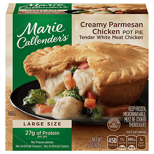 Put the taste of homemade flavor on your kitchen table with Marie Callender's Creamy Parmesan Chicken Pot Pie. This satisfying and hearty frozen pot pie features chunks of tender white meat chicken, broccoli, carrots, peppers and a creamy parmesan cheese sauce with a golden, flaky crust that's made-from-scratch. Enjoy a homestyle microwave meal that includes 27 grams of protein with no preservatives and no artificial flavors or colors. Heat this comforting chicken pot pie in the conventional oven or microwave for an easy-to-prepare pot pie dinner that's sure to satisfy. Enjoy warm, hearty ingredients and delicious homemade comfort food taste with Marie Callender’s.
