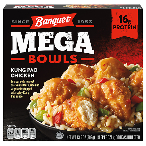 Banquet Mega Bowls Kung Pao Chicken frozen meal brings exciting flavor to your table. Featuring tempura white meat chicken fritters topped with spicy Kung Pao sauce and vegetables over rice for a delicious Kung Pao chicken bowl with a kick. This frozen rice bowl offers 16 grams of protein per serving to put hunger in its place. Enjoy Banquet Mega Bowls as flavorful frozen lunches or quick and easy frozen dinners any day of the week. Preparation of these ready made meals is easy. Just follow the instructions on the box to heat the frozen food in the oven for fresh-baked flavor or in the microwave for quicker cook time. Store the 13.5 ounce frozen meal in the freezer until you’re ready to enjoy. Banquet Mega delivers hearty meals that will keep bringing you back for more.